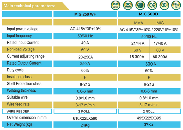 - MIG250WF with inbuilt wire feeder and can also be used for gas-less welding using flux core wire.