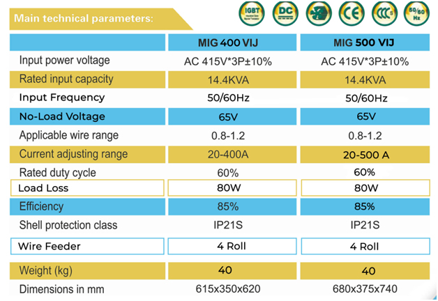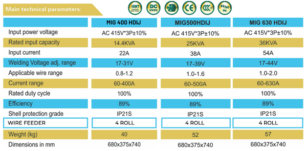 - 220V/415V power input automatically changing, non crystalline core, high capacity and low loss (MIG 300D)
